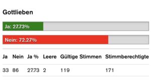 - Gottlieben hat die SRG-Halbierungsinitiative mit dem höchsten Nein-Anteil im Kanton Thurgau abgelehnt, und zwar mit 72.3 Prozent. Nein-Stimmen gingen 86 ein, Ja-Stimmen gab es 33. Im Kanton Thurgau lautete das Resultat zur SRG-Halbierungsinitiative 56 Prozent Nein. Auf nationaler Ebene hiess das Resultat 61.9 Prozent Nein.