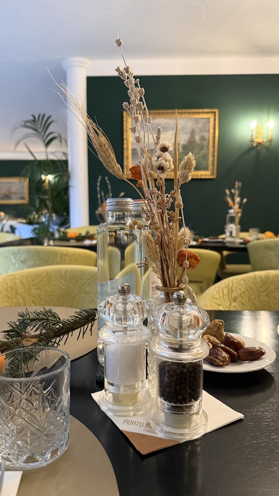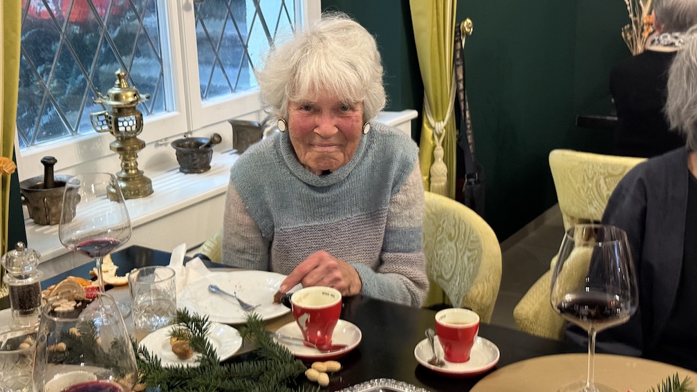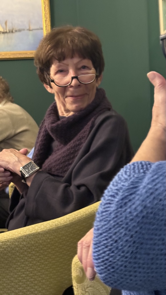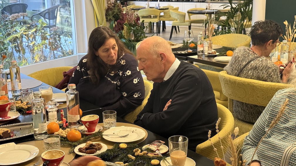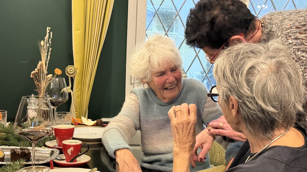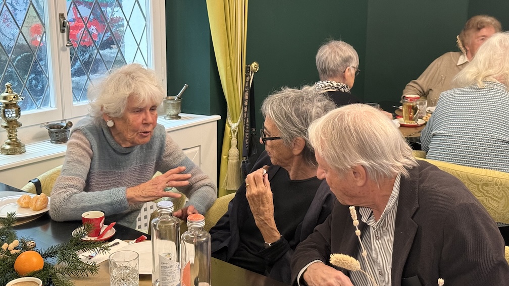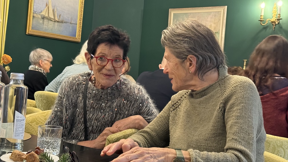 Zuvor hatten Eve und Ursula den Raum winterlich festlich vorbereitet und ein schönes Ambiente geschaffen; Tannenreis, Orangen, Mandarinen, Datteln, Feigen, Nüssli und Schöggeli schmückten die Tische, luden zum Geniessen ein. Aus der Porto-Sofie-Küche gab’s zum Zvieri Flammkuchen und Kuchenstücke. Und eine hübsche Flasche Wein fand Anklang.