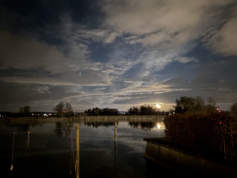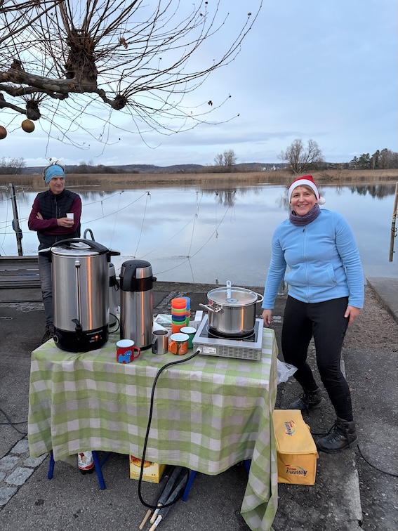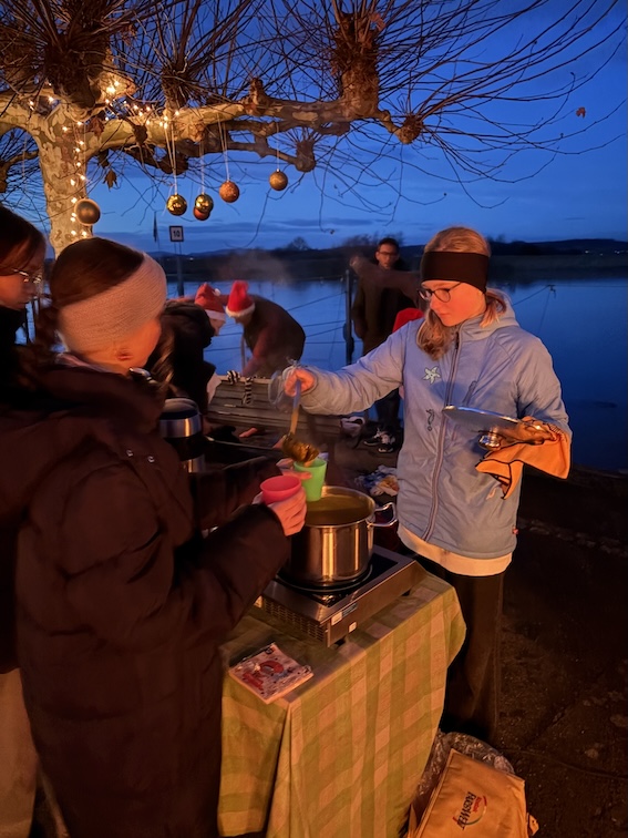 Am 6. Dezember zeigte sich der Seerhein von seiner ruhigen Seite: 8°C im Wasser, ungefähr genauso kühl in der Luft. Doch schon ab 16 Uhr kam Leben an den Schlipf beim Seecafé. Bäume wurden weihnachtlich herausgeputzt, eine grosse „6“ schmückte einen Bootsplatz-Pfosten und der Duft von Glühwein und frisch gekochter Kürbissuppe zog durchs Dorf. Eine Feuerschale sorgte zusätzlich für gemütliche Adventsstimmung.
