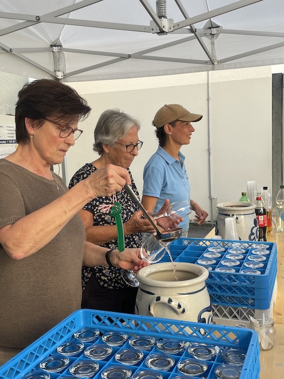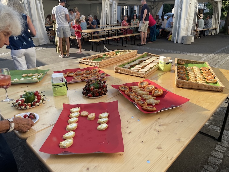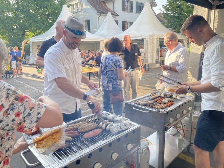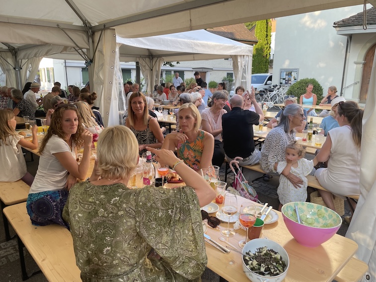 Die Bürgergemeinde hatte mit ihren Helferinnen und Helfern unter der Leitung von Bürgerpräsidentin Esther Höppli (Bild) ganze Arbeit geleistet. Als die Gottlieberinnen und Gottlieber, die zugewandten Ort, die Freunde von Gottlieben, die Ehemaligen, die Heimweh-Gottlieberinnen und Gottlieber und … nach 18.30 Uhr auf den Kirchplatz strömten, war alles wie gewohnt bestens vorbereitet. Beim Ausschank für den Apéro mit den legendären Bowlen (wie gewohnt mit und ohne Alkohol) bildete sich schon bald eine längere Schlange – eine gute Gelegenheit, um gegenseitig ins Gespräch zu kommen und nachher auf den längsten Tag und so manch anderes Schönes anzustossen. Dazu gab es feine Häppchen, die ebenfalls reissenden Absatz fanden.