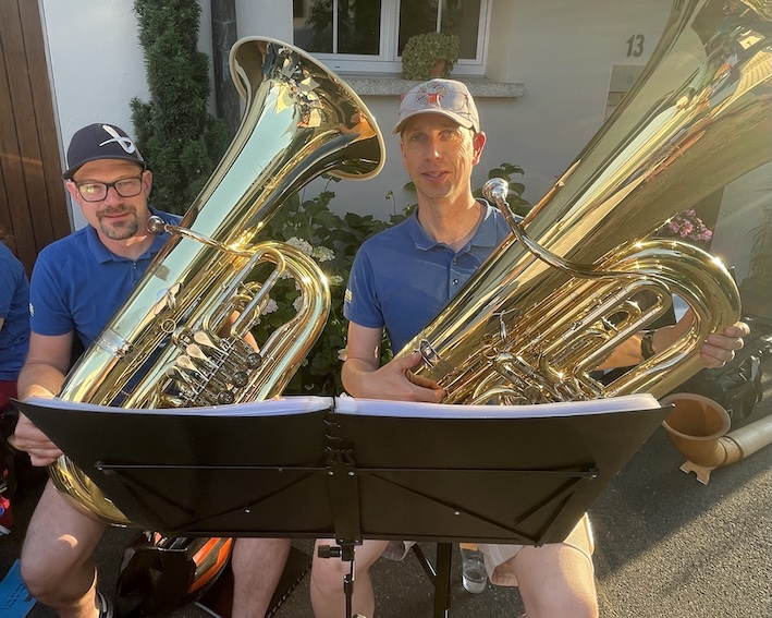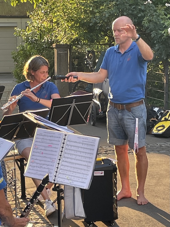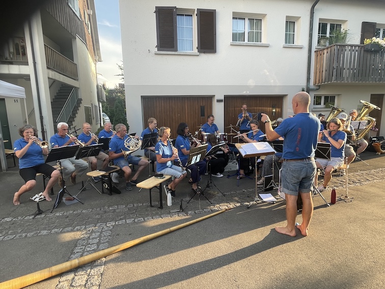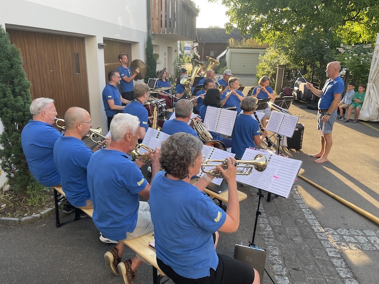Ab 20 Uhr dann begeisterte der Musikverein Tägerwilen – der ja in Gottlieben gegründet worden ist, wie Dirigent Thomas Gmünder (Bild) zum Auftakt bemerkte – mit einem sommerlich beschwingten Programm während fast eineinhalb Stunden. Auch wenn die Gespräche dabei weitergingen, gelang es den rund 20 Musikerinnen und Musikern mit ihrem höchst abwechslungsreichen Programm hervorragend, das Publikum immer von Neuem mitzunehmen, wie der tosende Applaus nach jedem Stück zeigte. Sie haben viel zur fröhlichen und ausgelassenen Stimmung auf dem Kirchplatz beigetragen. Herzlichen Dank!