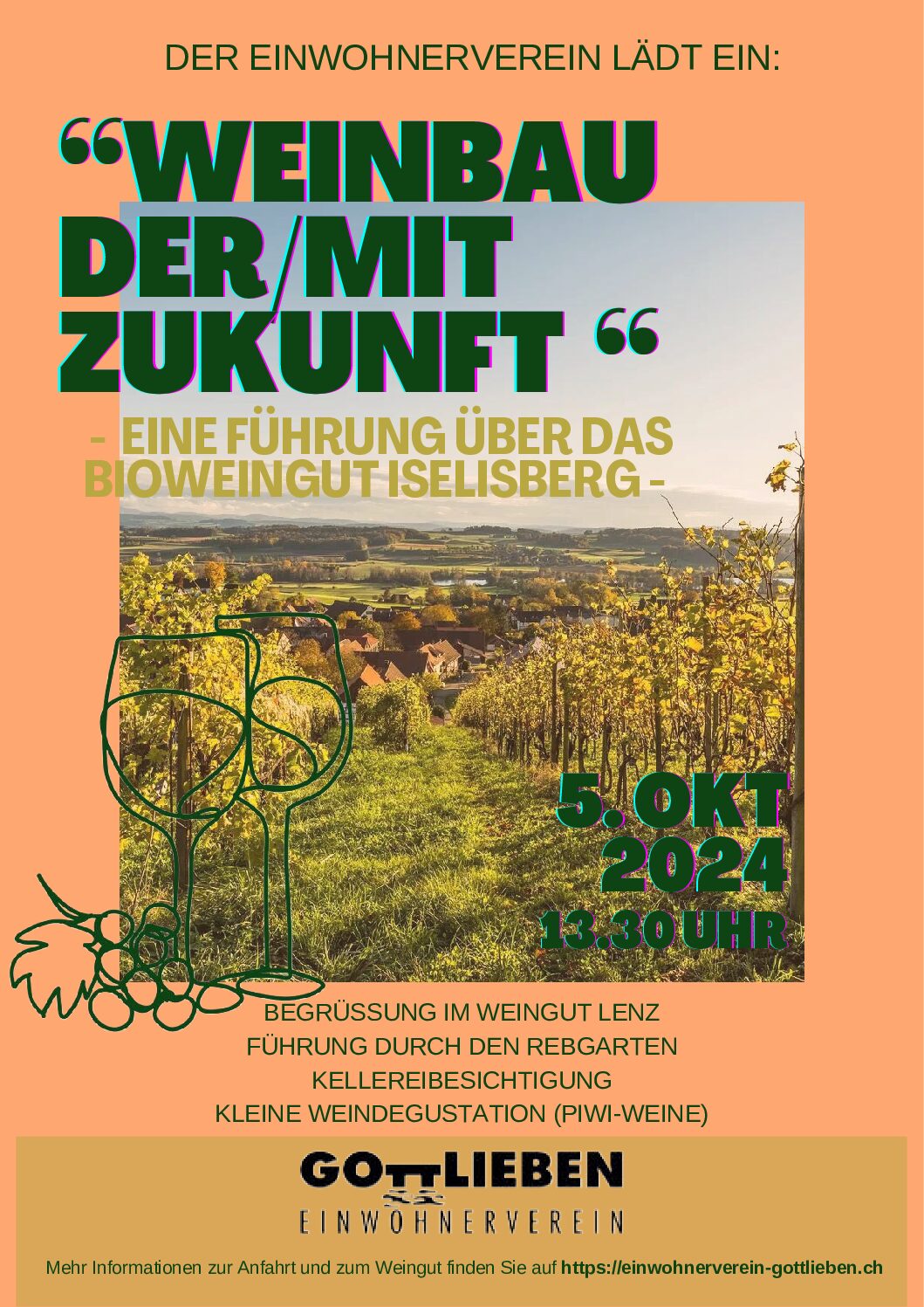 ----------------------------Datum: Samstag, 5.10.2024 13:30 – ca. 16:00Treffpunkt:Bioweingut Roland und Karin LenzIn Iselisberg 23Uesslingen/TGAnreise:Mit dem Zug - Tägerwilen / Gottlieben ab 12:08, Kreuzlingen BHF ab 12:16 Gl.2, ab Frauenfeld (Bus 822, Richtung Oberneunforn, Gemeindehaus) 12:49, an Iselisberg, Abzweigung 13:03ca. 10 Minuten Fussweg von der Bushaltestelle bis zum Weingutoder ev. mit FahrgemeinschaftenDurchführung:Der Anlass findet bei jedem Wetter statt.Anmeldung:anmeldung@einwohnerverein-gottlieben.ch-------------------------